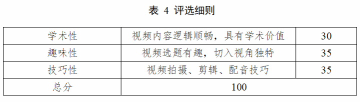 短视频作品收集完毕后,由各学院专业人员组成评委,对视频,从各个学科按照不同的评分标准进行客观评分,最终的评审结果将会在大赛QQ群进行公示。评委打分将从学术性、趣味性、技巧性三个模块,对作品进行打分,打分采用百分制,各模块占总分比值为: