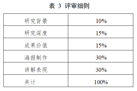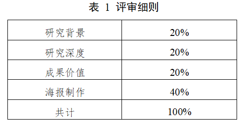 决赛环节参赛者需要对海报研究内容进行讲解,评委从研究背景,研究深度,成果价值,海报制作及讲解表现五个模块对作品打分,采用百分制,各模块占总分比值为: