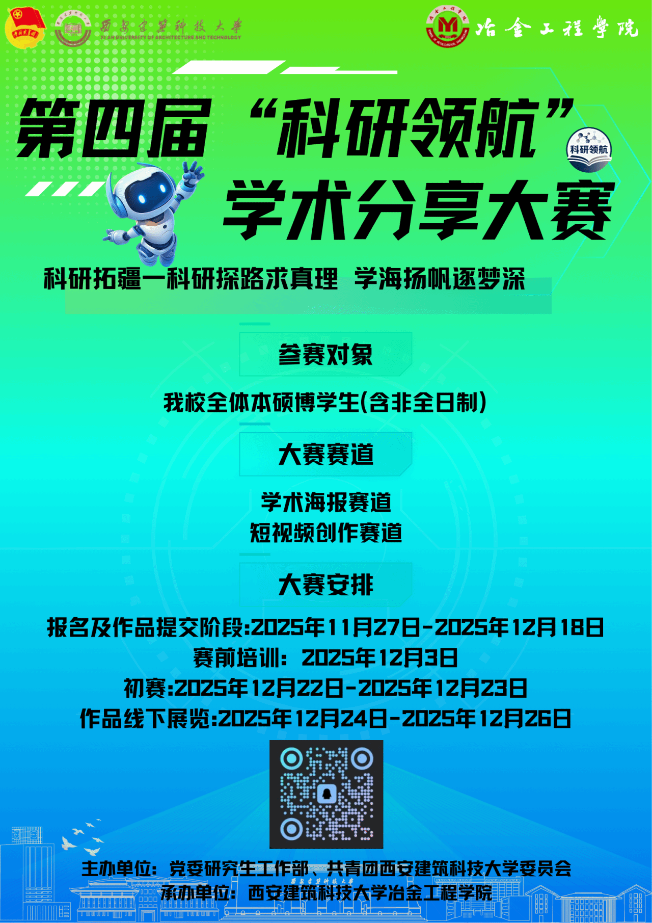 为了营造良好的学术氛围,提升研究生创新实践能力,拓宽研究生视野,充分展示我校学生的科研水平和精神风貌。西安建筑科技大学党委研究生工作部决定举办西安建筑科技大学第四届“科研领航”学术分享大赛,由冶金工程学院承办本次大赛。